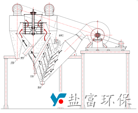 鹽富環(huán)保公司生產(chǎn)的YF-SF復(fù)合選粉機(jī)是將靜態(tài)的V型選粉機(jī)和內(nèi)循環(huán)高效渦流選粉機(jī)有機(jī)結(jié)合,可分級(jí)粒徑為4.75mm甚至 粒徑達(dá)10mm以上的物料。來料首先通過靜態(tài)的V選進(jìn)行粗細(xì)分離,中砂和細(xì)砂隨上升的氣流進(jìn)入高效渦流選粉機(jī)進(jìn)行分級(jí),石粉則被旋風(fēng)筒收集。從老式的轉(zhuǎn)子選粉機(jī)只能對(duì)機(jī)制砂簡(jiǎn)單脫粉到實(shí)現(xiàn)粗、中、細(xì)砂的 分級(jí)。
